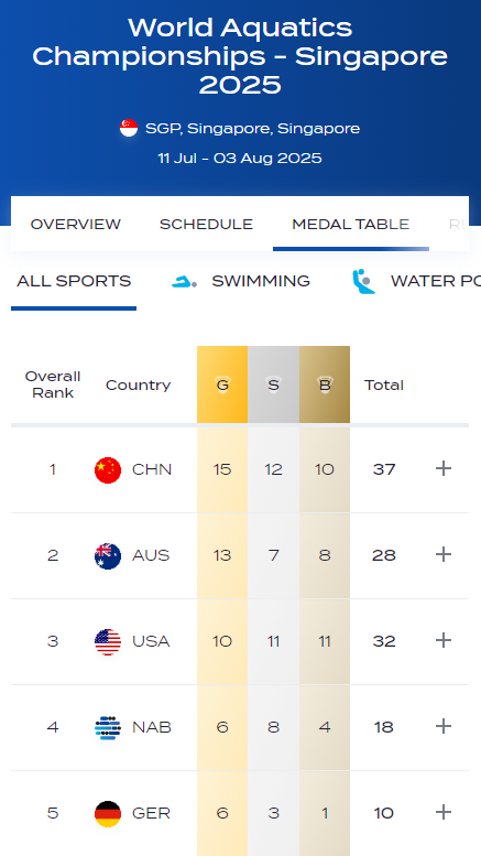 8月3日晚,2025年新加坡世界泳联世锦赛正式落下帷幕。中国队共获得15枚金牌、12枚银牌和10枚铜牌,结束本次世锦赛之旅。祝贺中国健儿,期待再创佳绩!